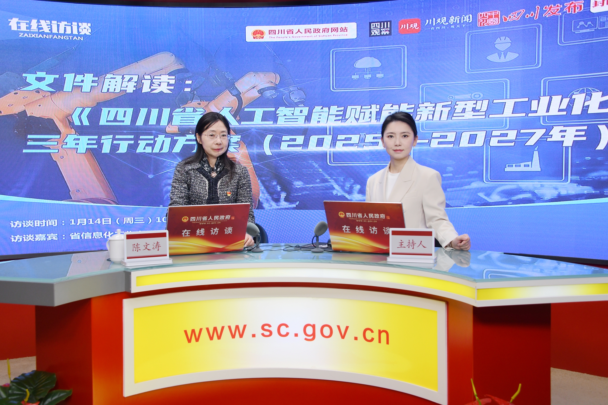 近日,四川省政府办公厅正式印发《四川省人工智能赋能新型工业化三年行动方案(2025—2027年)》(以下简称《行动方案》),作为西部首个省级层面明确推动人工智能在新型工业化领域应用的文件,这份方案为四川制造业从数字化向智能化跃升划定了清晰路径。省信息化工作办公室专职副主任陈文涛、经济和信息化厅智能化发展处黄鹏处长于1月14日上午在省政府网站在线访谈中,对方案核心内容进行了深度解读,回应社会关切。
